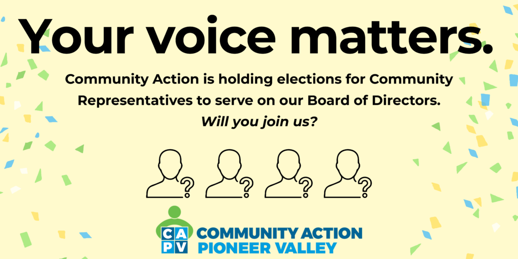 Community Action Pioneer Valley does not discriminate on the basis of race, color, national origin, gender or gender identity, age, religion, familial status, sexual orientation, disability, ancestry, marital status, source of income, veteran history/military status, or genetic information.